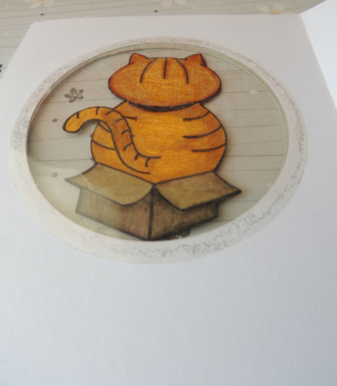 A su vez en acetato cortamos dos círculos de 9.5 cm de diámetro y ensanduchamos el gato entre los círculos de acetato y con pegamento unimos los círculos a la tarjeta.