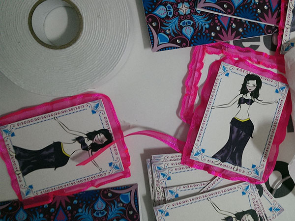 La imagen de base de la tarjeta en tonos rosa, morado y azul evoca el colorido de esta hermosa cultura y amplía la gama de posibilidades en la decoración, decorada con tul y cintas a juego, y como imagen principal una bailarina árabe.