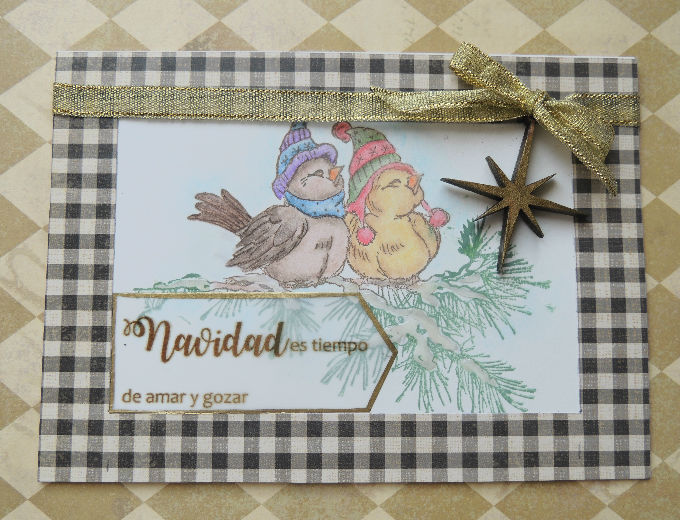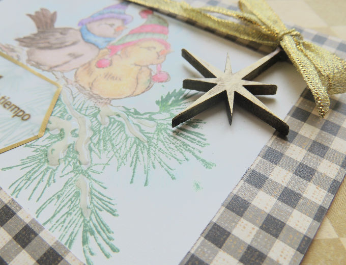 Con el sello Cling Winter Birds de Stampendous elaboramos esta hermosa tarjeta navideña, en una clásica escena de Navidad. El sello fue coloreado con lápices de colores, y la decoramos con una estrella en madera y cinta dorada.