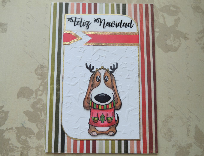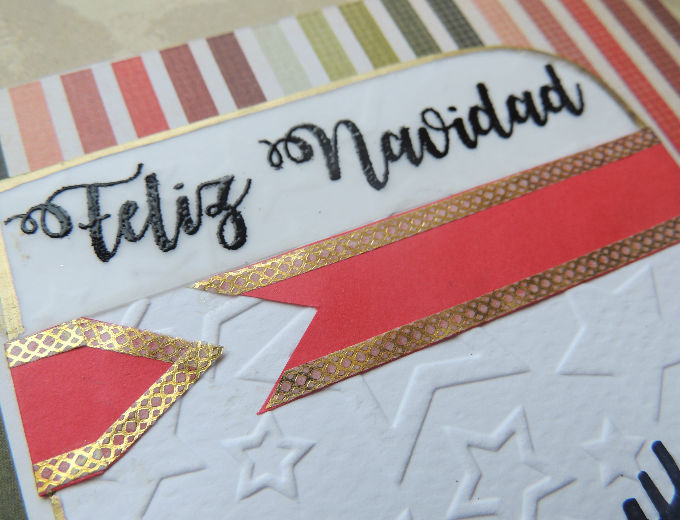 Elabórala con pocos materiales y con mucha creatividad. Sólo usamos una carpeta de embossing para darle un toque festivo al papel. El embossing del letrero se hizo sin sellos, sólo con impresora y polvo de embossing, y usamos nuestro sello digital de Tommy navideño que podrás descargar más abajo.