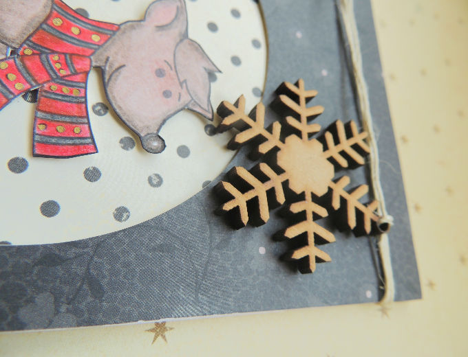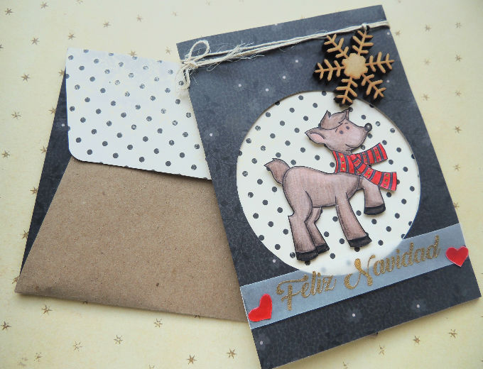 La tarjeta reno la elaboramos con un sello propio que podrás descargar más abajo y realizamos embossing con la impresora y polvo de embossing dorado, decoramos con un cristal de nieve en madera y cabulla. Para hacer el círculo en el papel usamos un cortador de círculos, demostrando así que no se necesitan grandes herramientas para tener resultados hermosos.