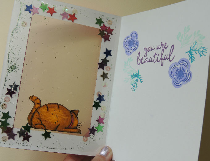 Está diseñada con una ventana en acetato que permite ver el interior de la tarjeta. El gato posee delantera y trasera por lo que podemos verlo cuando abrimos la tarjeta