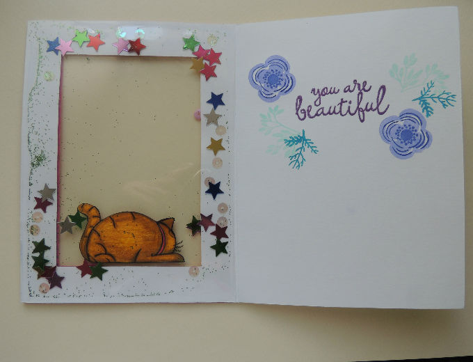 Hacemos una ventana de 8 cm. de ancho por 12.5 cm. de alto en la tarjeta que luego cubriremos con dos láminas de acetato de 12.4 cm. x 17.5 cm. Y hacemos un marco en color rosa de 2 cm. Dentro de las dos láminas de acetato pusimos pequeñas estrellas y lentejuelas y también pusimos el gato dormilón.
