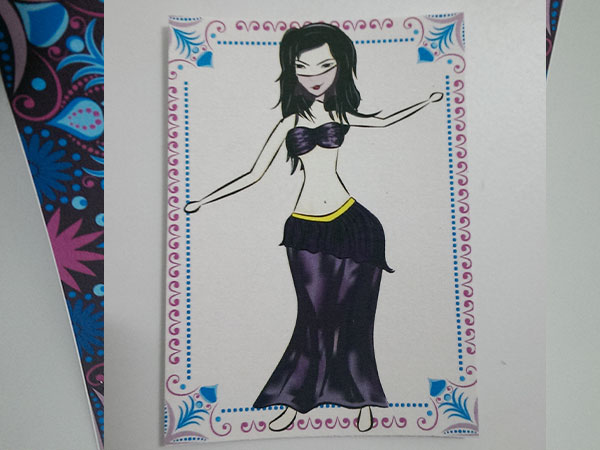 La imagen de base de la tarjeta en tonos rosa, morado y azul evoca el colorido de esta hermosa cultura y amplía la gama de posibilidades en la decoración, decorada con tul y cintas a juego, y como imagen principal una bailarina árabe.