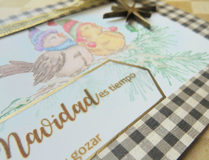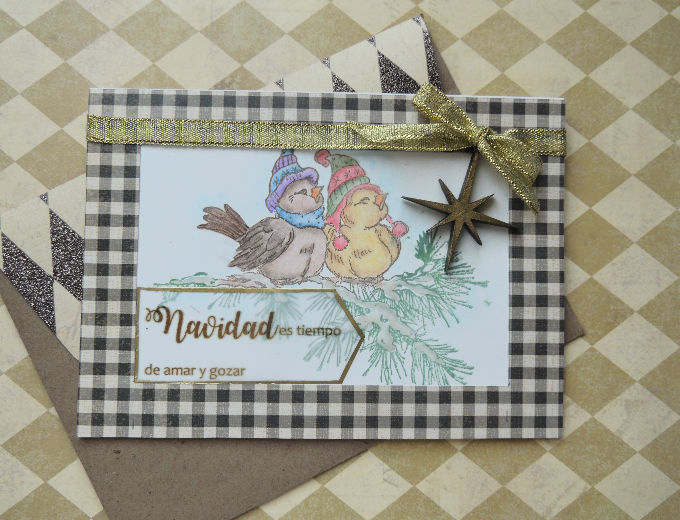 Con el sello Cling Winter Birds de Stampendous elaboramos esta hermosa tarjeta navideña, en una clásica escena de Navidad. El sello fue coloreado con lápices de colores, y la decoramos con una estrella en madera y cinta dorada.