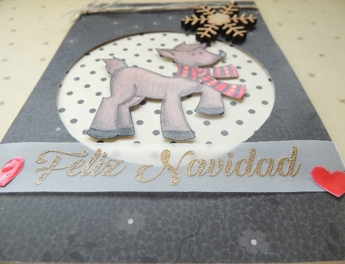 La tarjeta reno la elaboramos con un sello propio que podrás descargar más abajo y realizamos embossing con la impresora y polvo de embossing dorado, decoramos con un cristal de nieve en madera y cabulla. Para hacer el círculo en el papel usamos un cortador de círculos, demostrando así que no se necesitan grandes herramientas para tener resultados hermosos.